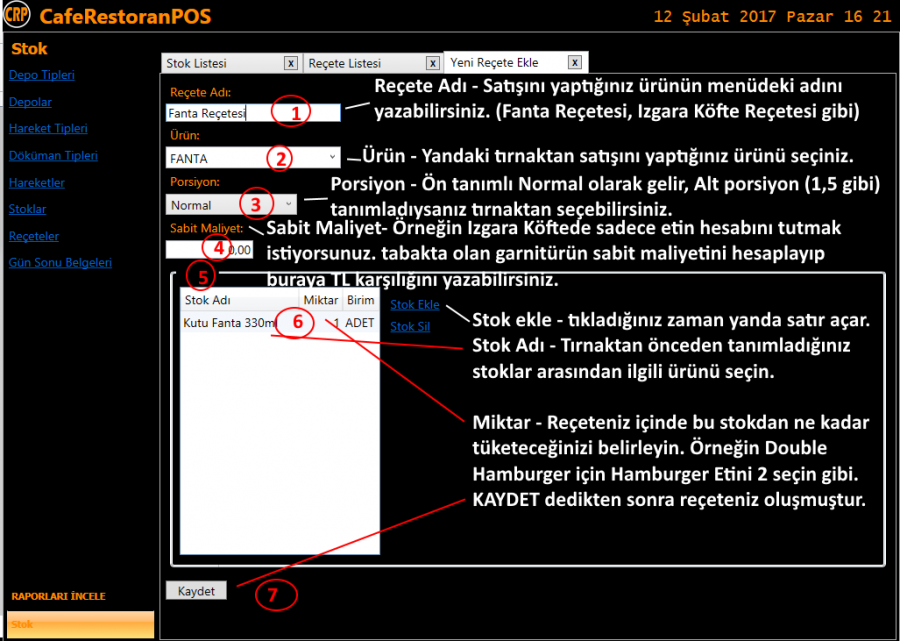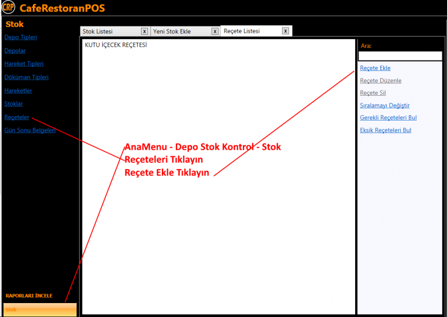 ÖNEMLİ Bir Hatırlatma Stok tanımlarını istediğiniz zaman yapabilirsiniz. Reçete girişlerini de istediğiniz zaman yapabilirsiniz. Yapılan bir reçeteyi silme veya reçete içinde düzenlemeyi Kapanış yapmanızdan Açılış yapmanıza kadar geçen süre içinde yapmanız gereklidir. Gün içinde yapacağınız reçete düzenlemesi ve reçete silmesi sistemde hataya sebep olur. Böyle bir hata ile karşılaşırsanız sildiğiniz reçeteleri yeniden oluşturmak ve eski haline getirmeniz gerekir.